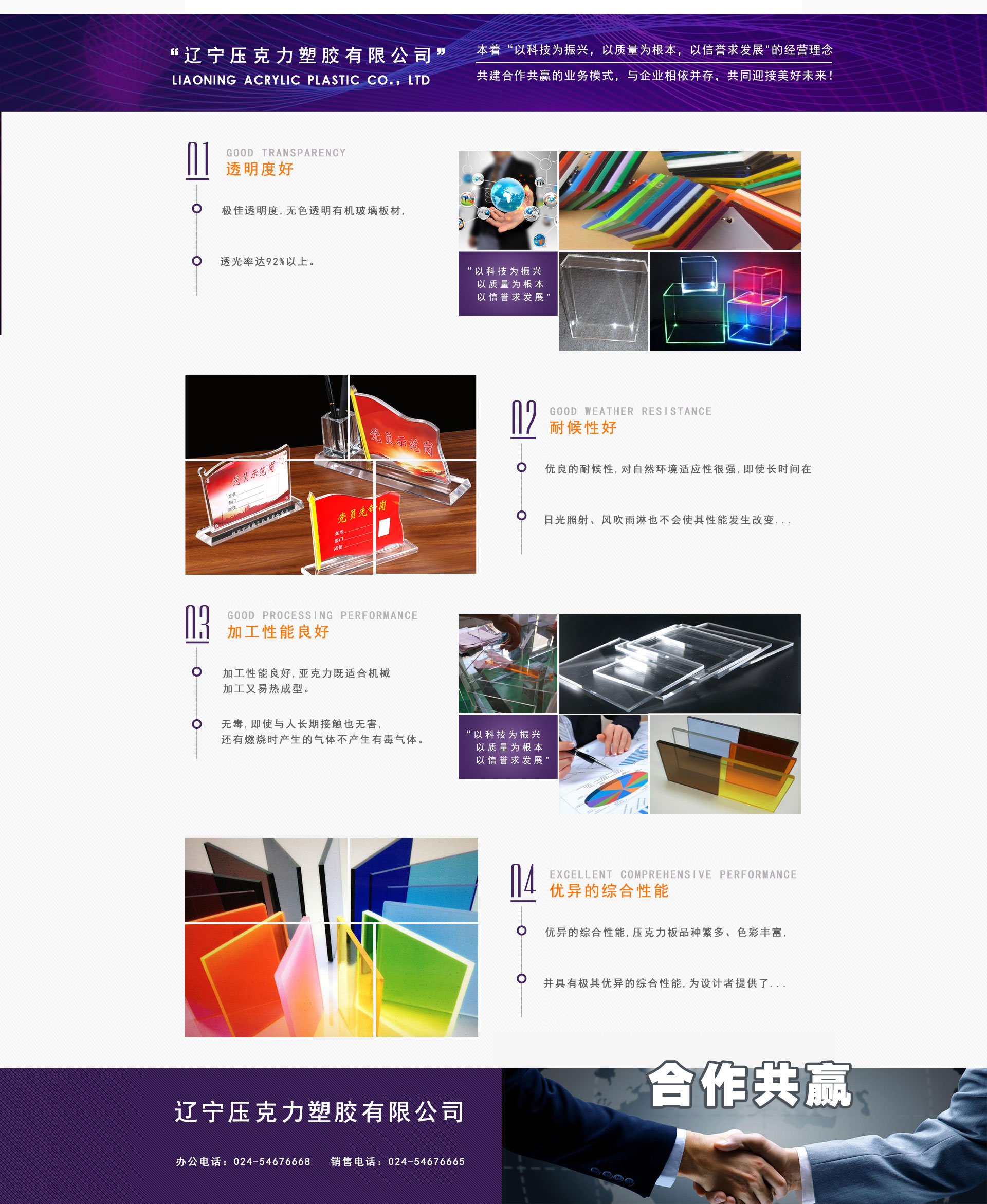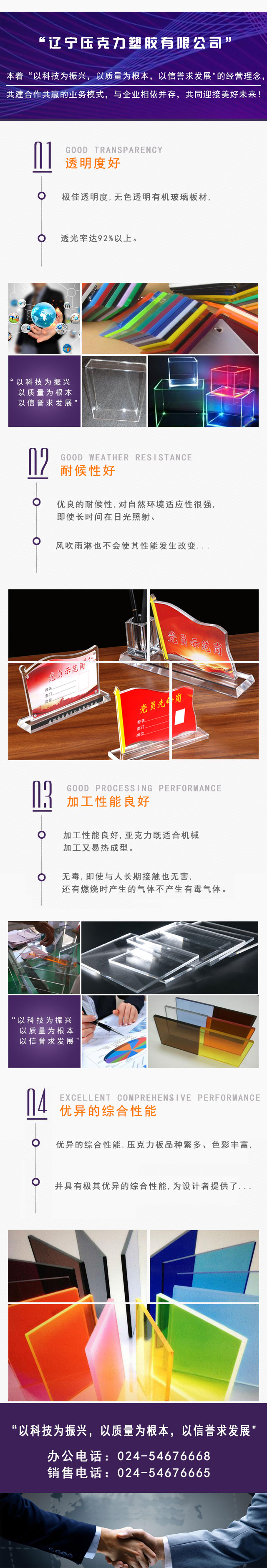 遼寧壓克力塑膠有限公司是一家生產(chǎn)亞克力板材及亞克力制品的專(zhuān)業(yè)企業(yè),公司坐落于遼寧省撫順市東洲區(qū)海新工業(yè)園區(qū)內(nèi),占地叁十余畝,廠(chǎng)房面積一萬(wàn)叁千五百多平方米。 我公司是實(shí)現(xiàn)PLC預(yù)聚工藝自動(dòng)控制的亞克力生產(chǎn)企業(yè),目前引進(jìn)兩條臺(tái)灣亞克力澆鑄板生產(chǎn)線(xiàn),確保生產(chǎn)出高品質(zhì)亞克力板材。公司從事亞克力行業(yè)已經(jīng)有幾十年歷史,擁有豐富的技術(shù)、營(yíng)銷(xiāo)隊(duì)伍。公司生產(chǎn)的亞克力吸塑板、衛(wèi)浴板、防靜電板、蜂窩板、廣告板、透明工程板,暢銷(xiāo)全國(guó),應(yīng)用于建筑、家具、廣告、儀表、科技研究等各個(gè)領(lǐng)域。產(chǎn)品質(zhì)量、制作技術(shù)及售后服務(wù)得到客戶(hù)的一致認(rèn)可,深受客戶(hù)信賴(lài)。 多年來(lái),公司申請(qǐng)了多項(xiàng)國(guó)家技術(shù)專(zhuān)利,不斷研發(fā)高新產(chǎn)品,先后被評(píng)為遼寧省先進(jìn)單位稱(chēng)號(hào)和AAA級(jí)信譽(yù)企業(yè)稱(chēng)號(hào),成為高新技術(shù)企業(yè),科技...